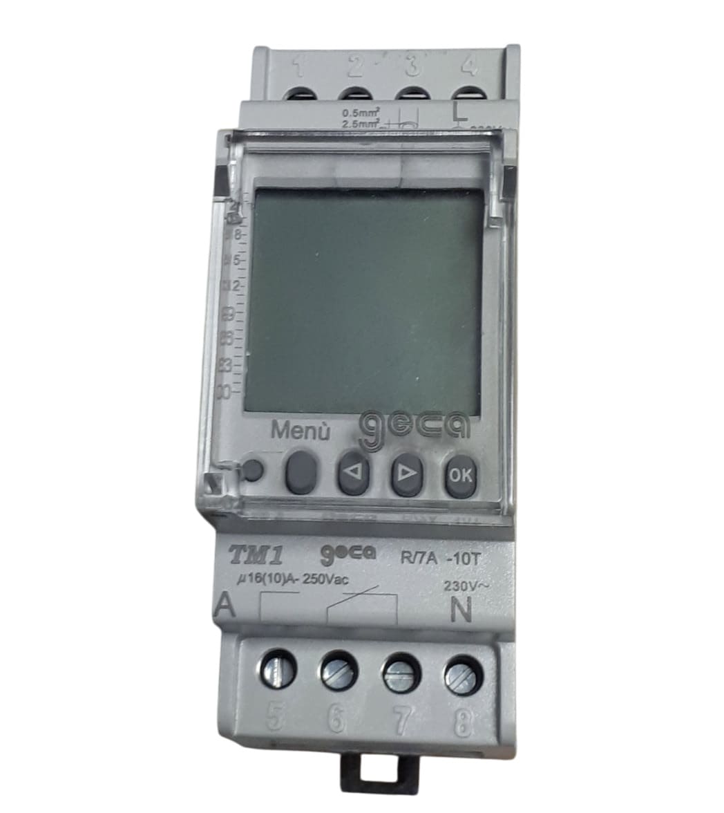 TM1 32152110 è un interruttore orario digitale giornaliero e settimanale due moduli a barra din, in grado di comandare l'accensione e spegnimento di un carico elettrico, impostando in maniera intuitiva un programma per mezzo dei pulsanti di cui è dotato.