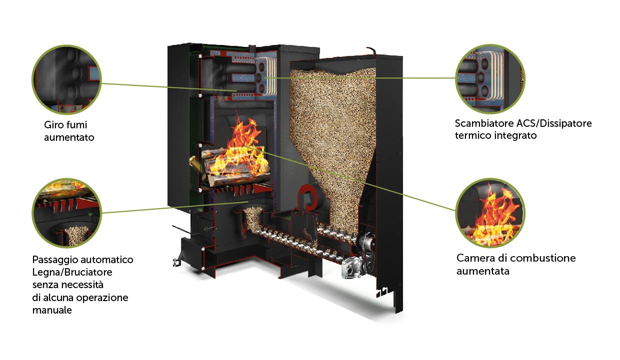 L'unica CALDAIA COMBINATA pellet, legna e granulari con possibilità di bruciare legna di lunghezza fino a 50 cm.