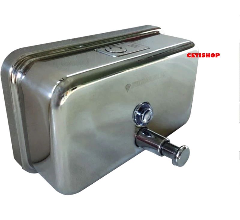 Distributore di sapone liquido orizzontale da parete realizzato in acciaio inox AISI 304, in finitura lucida o satinata. Funzionamento con pulsante a pressione, dotato di finestra di controllo esaurimento sapone e coperchio per il rabbocco munito di sistema di sicurezza con chiusura a chiave tipo forcella in INOX 304.