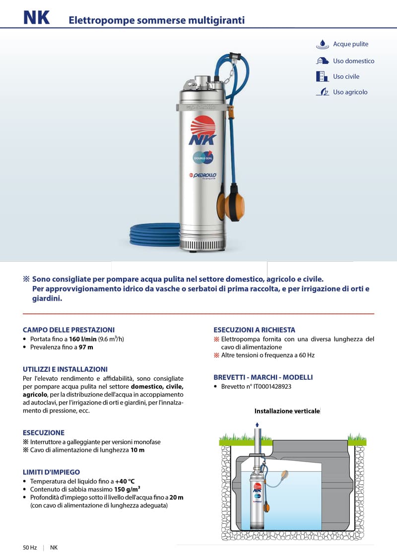 Elettropompa sommersa Pedrollo NK-GE multistadio 5" per pozzi e cisterne. Elettropompe sommerse multigiranti consigliate per approvvigionamento idrico da vasche o serbatoi di prima raccolta, e per impianti autoclavi, irrigazione giardini ed orti.