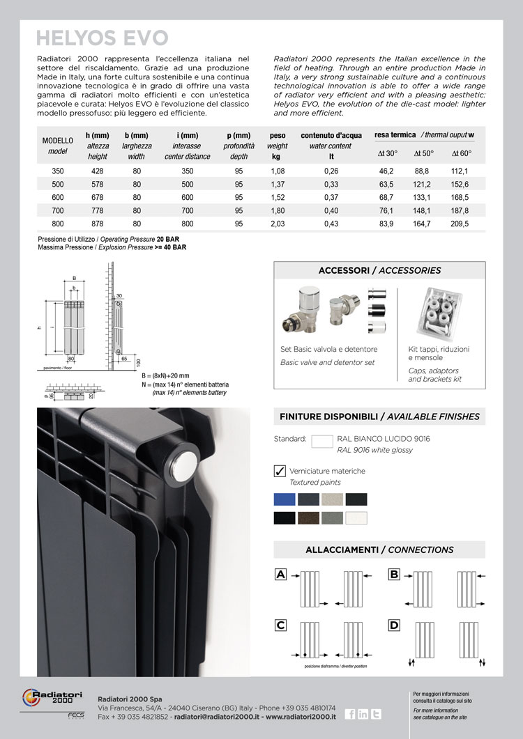 Termosifone Helyos Evo radiatori 2000 nelle altezze 500 600 700 800 , con la sua forma tondeggiante offre un design senza tempo e una visione d’insieme armoniosa che crea un piacevole equilibrio estetico in ogni ambiente. il suo processo di produzione ecologico e con un eccellente rapporto peso potenza, garantisce elevate prestazioni, bassi consumi e tempi di riscaldamento ridotti del 38% rispetto all’acciaio, mantenendo la sua efficienza e aspetto nel tempo grazie alla verniciatura e anaforesi. Facilmente adattabile a qualsiasi ambiente e capace di rispondere ad ogni esigenza.